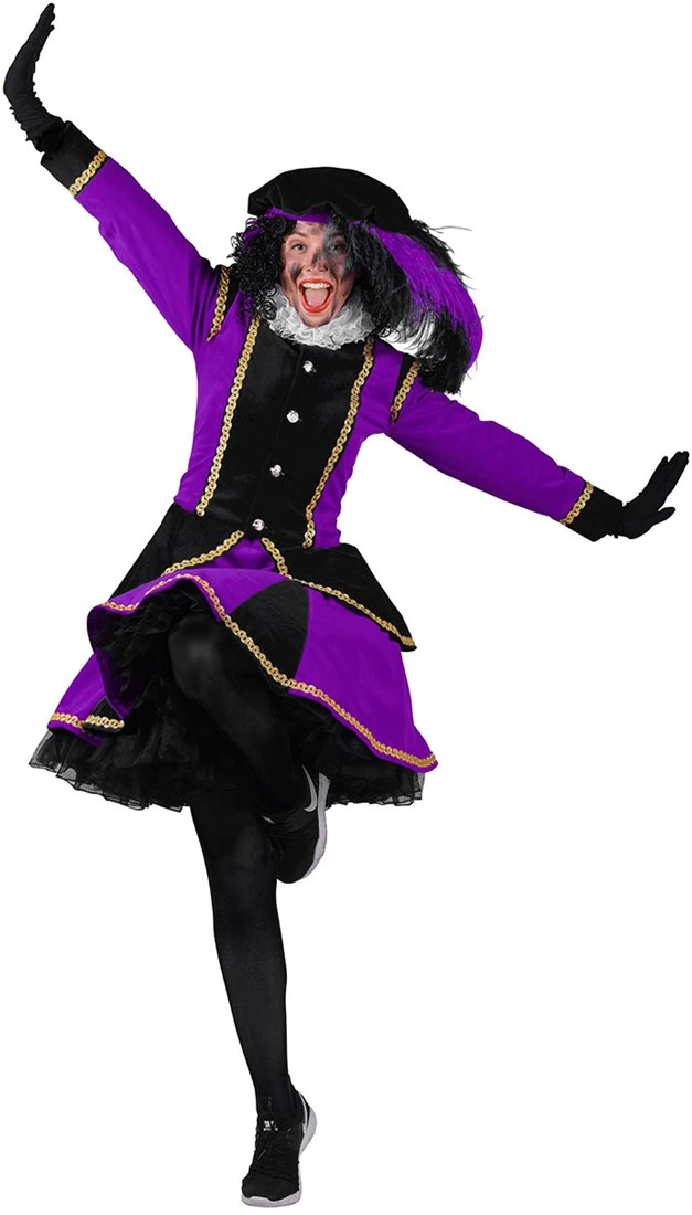 Een prachtig dames pietenkostuum in het zwart met paars. Het pak is van hoogwaardige kwaliteit, en is afgewerkt met goudband. Ideaal voor de intocht van Sinterklaas of voor pakjesavond uiteraard!