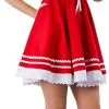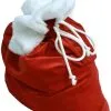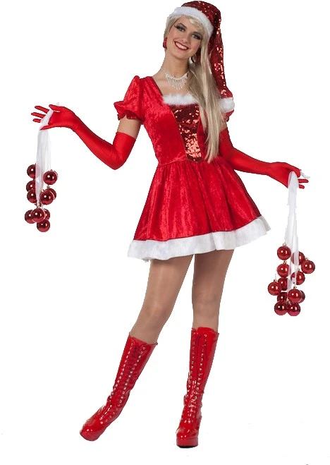 Een 2-delig kerstpakje voor dames, bestaande uit een jurkje met pofmouwtjes en een kerstmuts. Het pak is gemaakt van velour de panne.