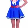 Details: mouwloos jurk met een plooienrokje. Op de borst zit een streepjes patroon met een witte kraag waar een anker op geborduurd is
