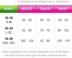 | Alle damesmaten | 34 = XS, 36/38 = S/M, 40/42 = L/XL, 44/46 = XXL/3XL |
