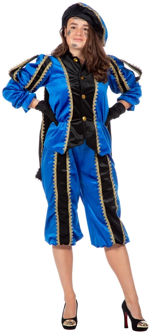 Zeer mooie kwaliteit Zwarte Pieten pak blauw speciaal voor dames. Het pak bestaat uit een Broek, Jasje, Cape en Baret. Ook verkrijgbaar in een heren variant.