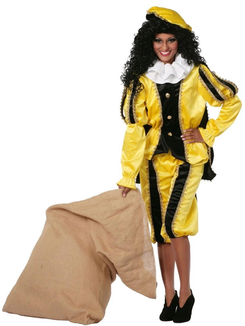 Zeer mooie kwaliteit Zwarte Pieten pak geel speciaal voor dames. Het pak bestaat uit een Broek, Jasje, Cape en Baret. Ook verkrijgbaar in een heren variant.