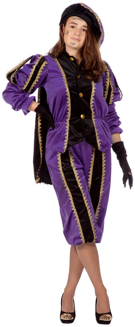 Zeer mooie kwaliteit Zwarte Pieten pak paars speciaal voor dames. Het pak bestaat uit een Broek, Jasje, Cape en Baret. Ook verkrijgbaar in een heren variant.