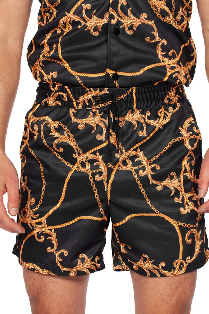 - Deze party outfit bestaat uit een hemd met een zwart goud designer print en een bijpassende short.