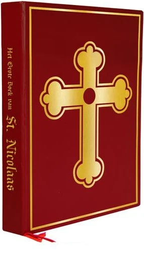 Details: een gouden lint om als boekenlegger te gebruiken en op de zijkant staat in het goud de tekst “Het Grote Boek van St. Nicolaas”