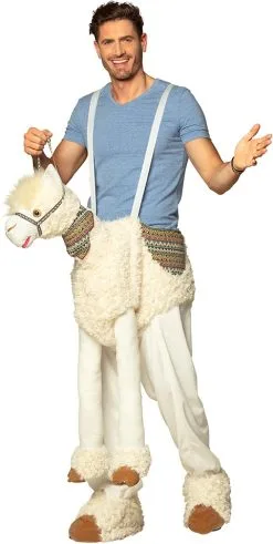 Met dit schattige maar grappige pak lijkt het net of je op de rug van een lama zit. Dit leuke pak bestaat ook in een kinder variant.