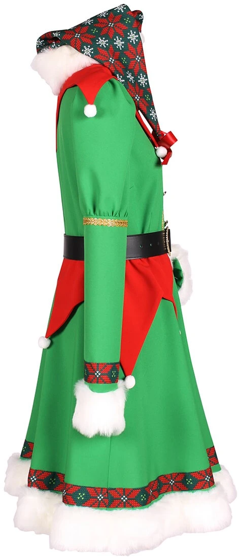 Details jurk: aan de kraag en taille rode punten met witte bolletjes. Mouw en onderaan jurk imitatie bont, galon en leuke biezen in een kerst design