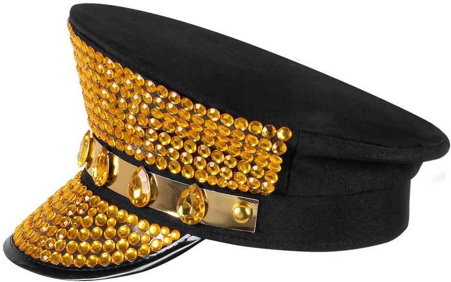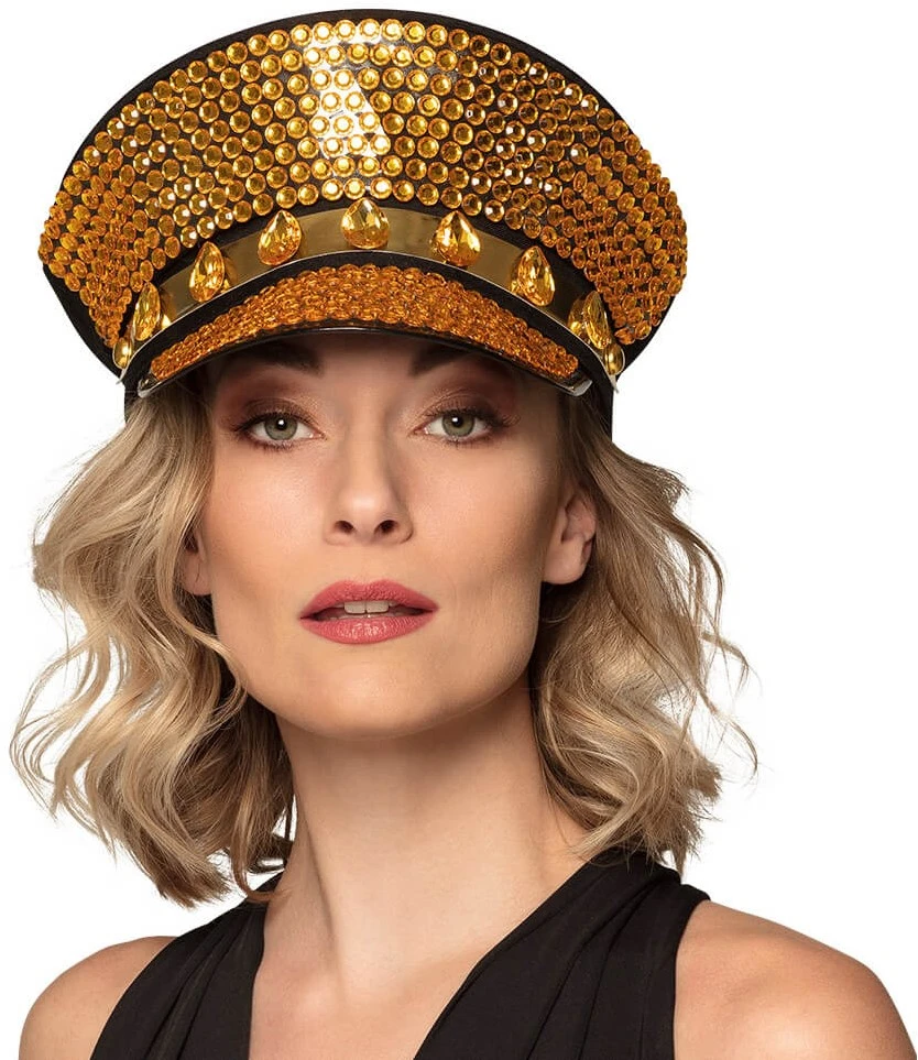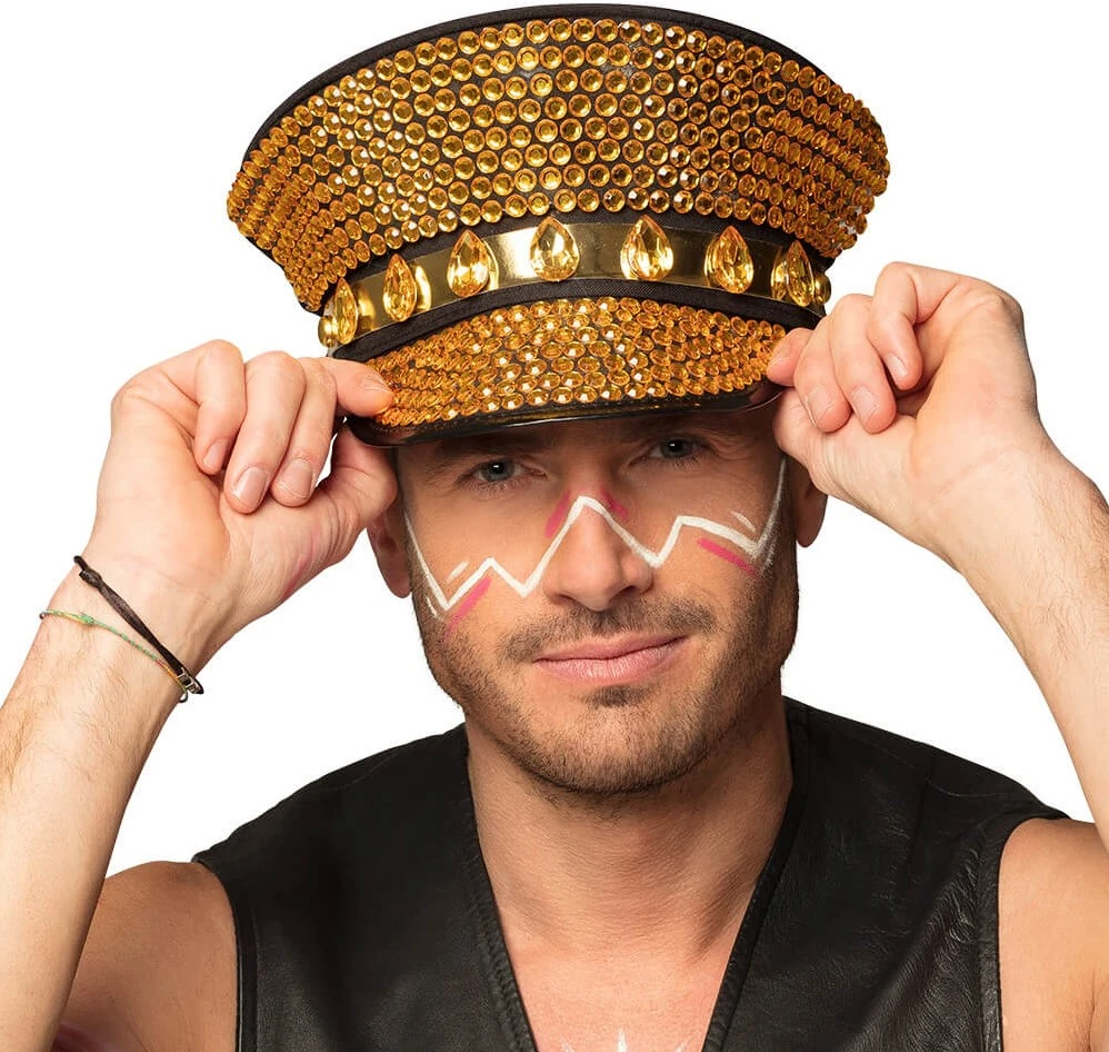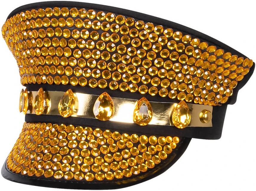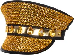 Details: de hele hoed is bedekt met strass stenen en in het midden een gouden band met druppelvormige strass stenen