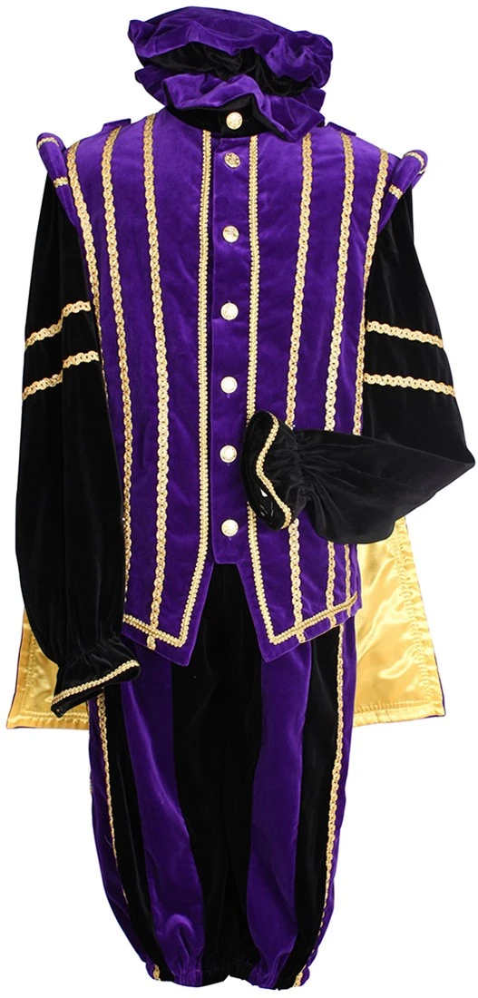 Een gaaf zwart/paars pietenpak met allerlei gouden details. Het kostuum is gemaakt van katoen en voelt lekker zacht aan. Bestaande uit de broek, jas, baret én cape.