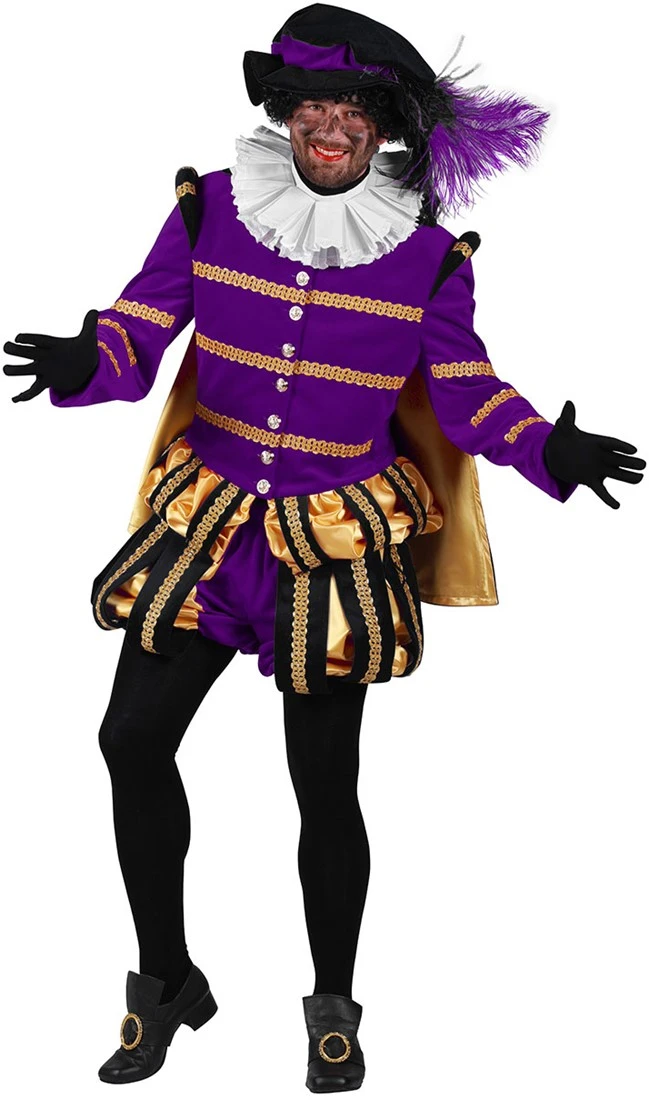 Een prachtig heren pietenkostuum in het zwart met paars. Het pak is van hoogwaardige kwaliteit, en is afgewerkt met goudband. Ideaal voor de intocht van Sinterklaas of voor pakjesavond uiteraard!