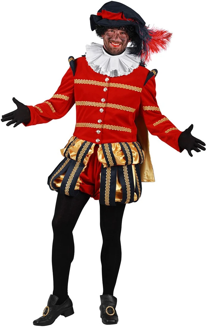 Een prachtig heren pietenkostuum in het zwart met rood. Het pak is van hoogwaardige kwaliteit, en is afgewerkt met goudband. Ideaal voor de intocht van Sinterklaas of voor pakjesavond uiteraard!