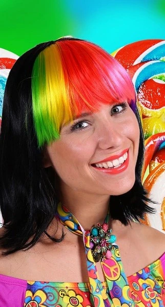 Deze halflange boblijn pruik Samantha Luxe in de kleur zwart-multi is voor de dames. Halflang model met pony om bijvoorbeeld uw hippie of disco outfit compleet te maken. De pruik is verstelbaar voor een goede pasvorm en gemaakt van kanekalon fiber (hoogwaardig en realistische kwaliteit). In meerdere kleuren verkrijgbaar.