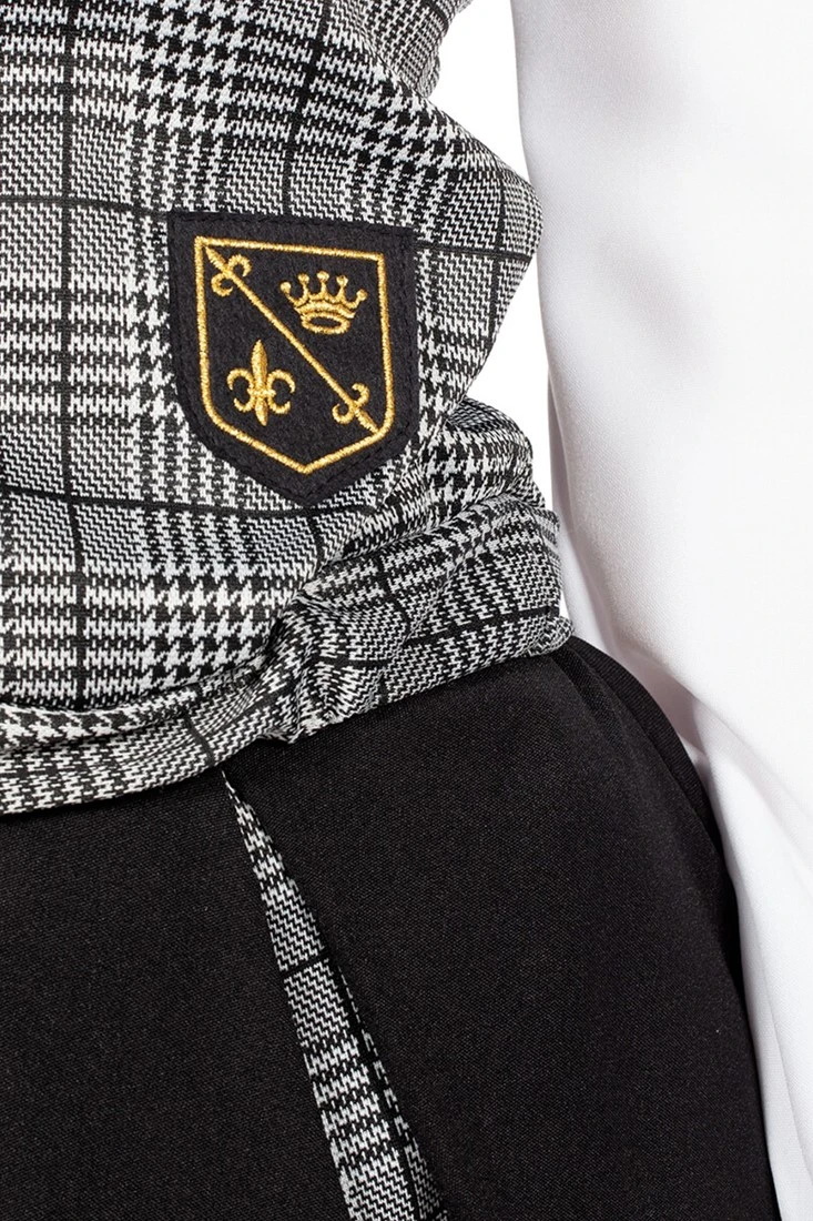 Details: blouse en spencer zitten aan elkaar vast. de rok heeft aan de voorkant plooien