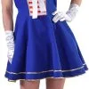Details: blauwe basis, grote kraag en afgewerkt met strepen en een witte strik